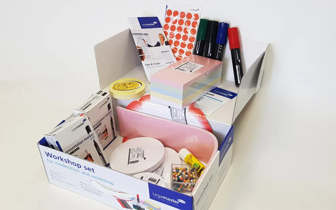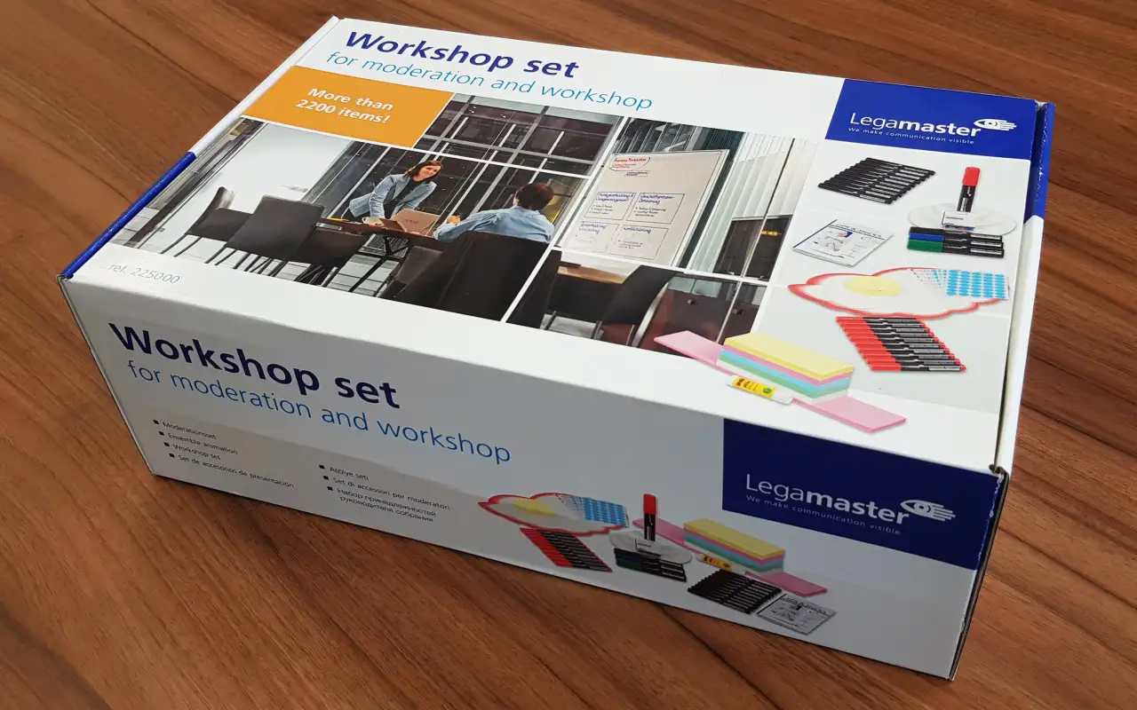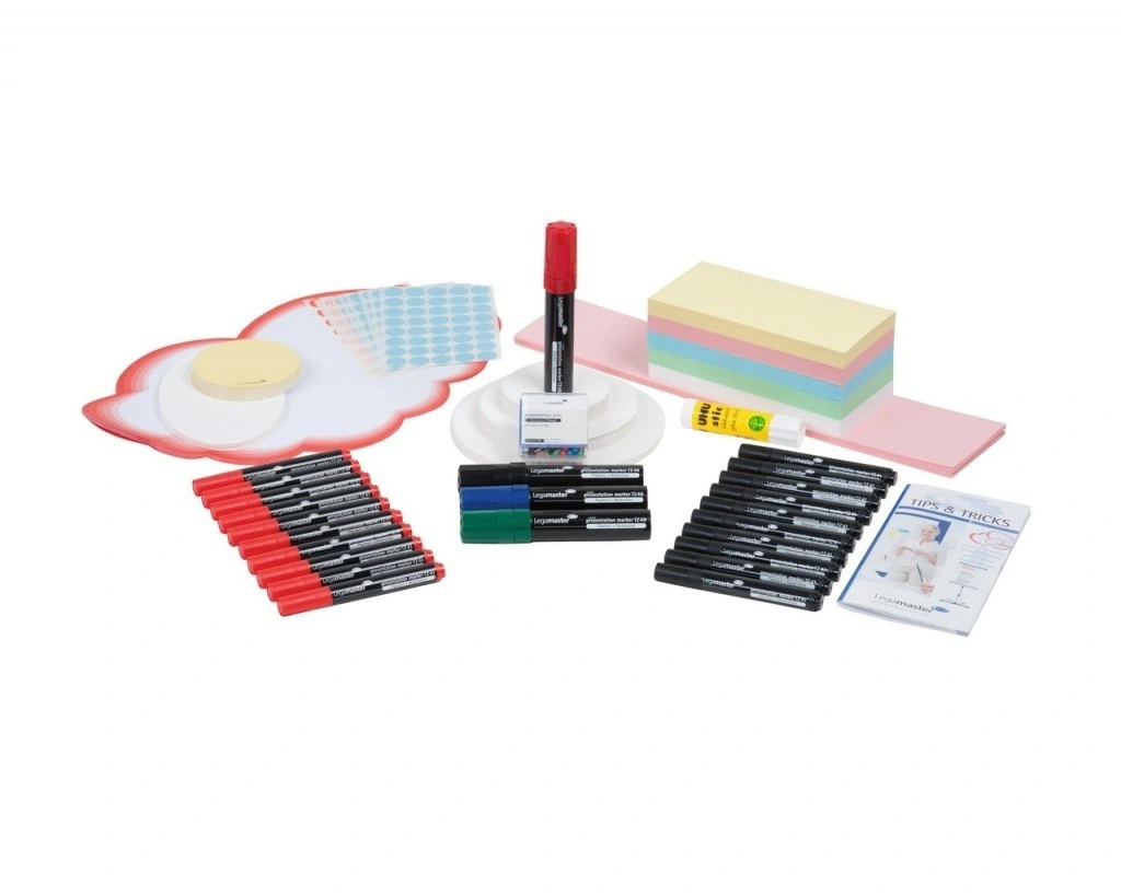 Prezentační sada pro jednodenní seminář s max. 15 účastníky. Může se použít také jako náhradní sada pro větší prezentační kufříky.Velikost: 38 x 12.5 x 23.5, váha 3 kg.Baleno v masivní kartónové krabici s držadlem.OBSAH: brožurka Tipy a triky, 100 karet smajlíků, 500 obdélníků (9.5x20 cm,mix), 100 kruhů (bílých, prům.9.5 cm), 100 kruhů (bílých, prům.14 cm), 50 kruhů (bílých, prům.19 cm), 50 oválů (bílých, 11x19 cm),20 popisovačů na papír TZ 41 (10 červených a 10 černých), 4 JUMBO popisovače (1 černý, červený, modrý a zelený),200 špendlíků (mix barev), 1 lepidlo, 10obláčků 26.5x43 cm, 1040 samolepících bodů (prům. 19mm, 520 modrých a 520 červených), 50 nadpisových štítků (10x46 cm, růžových).