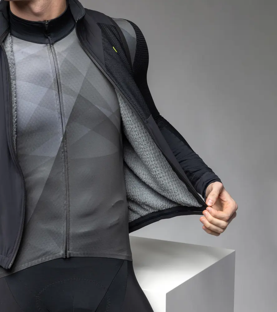 ALÉ RIPARO Jacket je pánská zimní vesta v závodním střihu, navržená pro středně až vysoce intenzivní vyjížďky i při teplotách pod bodem mrazu. V černém provedení (black) pro modelový rok 2027 nabízí skvělou rovnováhu mezi izolací, prodyšností a ochranou proti vlhkosti.